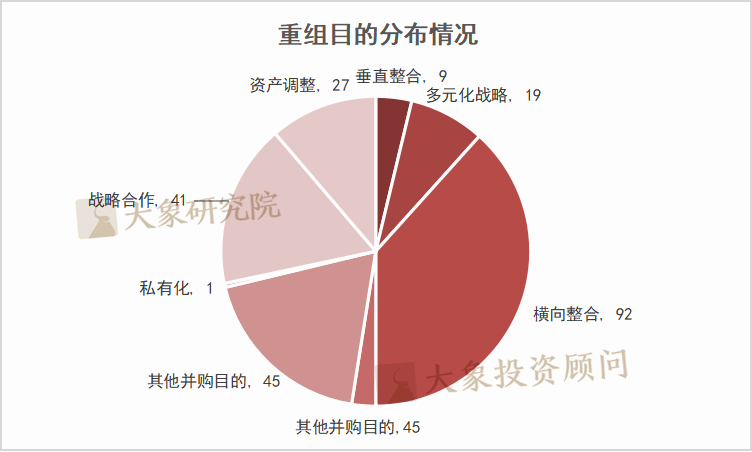 从240家上市公司的重组目的来看,横向整合有92家,其他并购目的有45家,战略合作有41家,资产调整有27家,多元化战略有19家,买壳上市有6家,垂直整合有9家,私有化有1家。