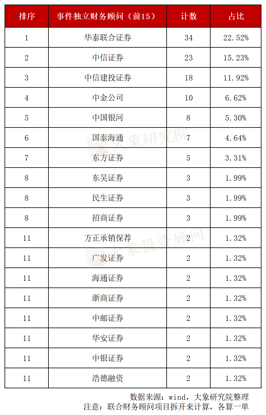 项目量最多的是,华泰联合证券,有34起并购项目,占比22.5%;其次是中信证券,有23单,占比15.23%;中信建投有18单,占比11.92%。