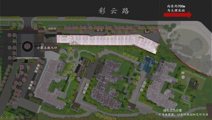 西侧机场路为途经市中心、大理古城、大理机场的必经之路,向北约9.6km到达大理机场,向南约8.9km到达大理站
