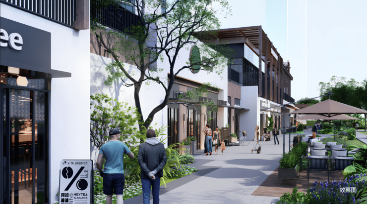 以海岛度假风为主题,利用木纹格栅及景墙,打造独具度假感的商业街区,商铺形象突出,第一时间捕捉消费客群视野,扼守消费动线,开门即迎八方来客。