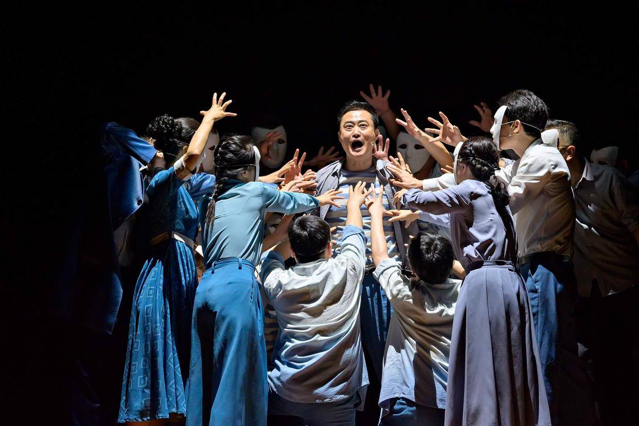 “面具戏”堪称全剧的精神高潮,六个面具人如异化的制度之影缠绕池大为,十二只手从不同方向拉扯撕裂,构成卡夫卡式的荒诞图景与内心外化的剧场瞬间。池大为挣脱面具之时,既是个体良知的觉醒,亦是知识分子在制度异化中对本真性的艰难持守。