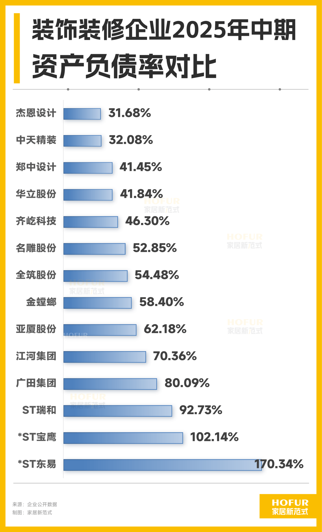 整体来看,14家装饰装修上市公司的负债偏高,今年中期资产负债率均值为66.92%。其中,东易日盛和宝鹰股份的资产负债率已超过100%,前者更是严重资不抵债,资产负债率高达170.34%。