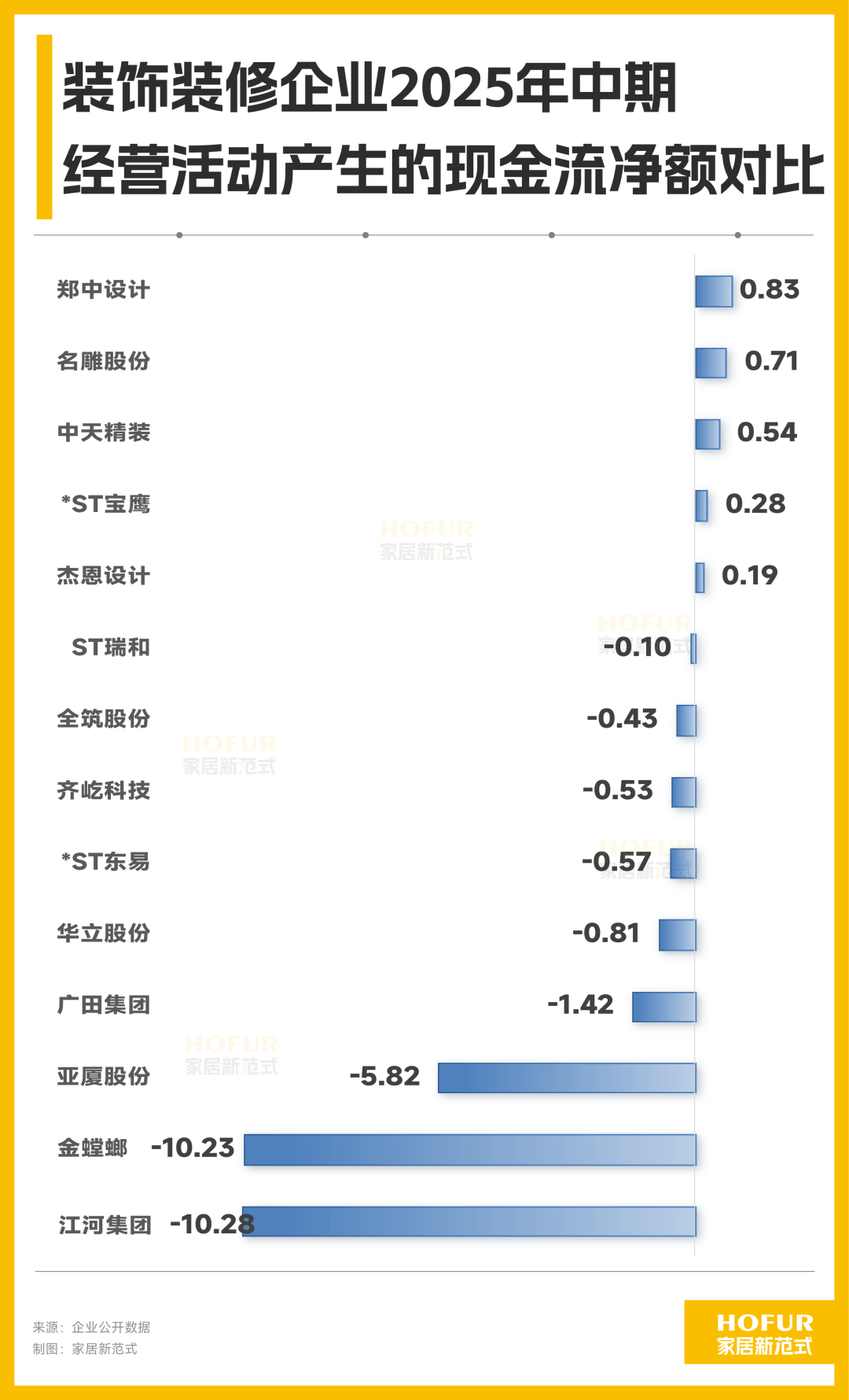 经营活动产生的现金流净额是衡量企业持续经营能力的重要指标。家居新范式梳理发现,金螳螂、江河集团和亚厦股份是规模排名前三的企业,但是经营活动产生的现金流净额均排名垫底。